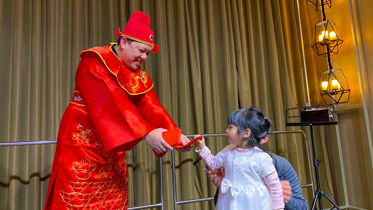 活動中最受期待的遊戲環節-「第一屆大愛眼科布丁盃比賽」,從各眼科診所中選出12位高手進行終極1PK,最終冠軍選手竟以不到40秒的驚人速度奪得勝利,讓看似簡單的布丁吸食挑戰瞬間成為全場焦點,趣味十足。活動也不忘為小朋友準備驚喜橋段,「財神爺派紅包」一登場直接引來另一波高潮,小朋友們興奮迎接財神到來,歡樂洋溢於全場。